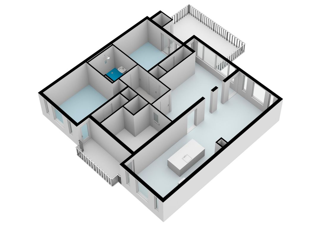 Appartement rechterzijde: eveneens L-vormig op de westzijde gelegen, identieke badkamer en slaapkamer aan de voorzijde met 1 vaste kast en een balkon.