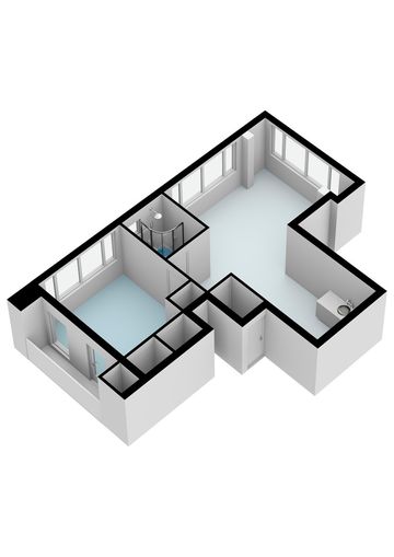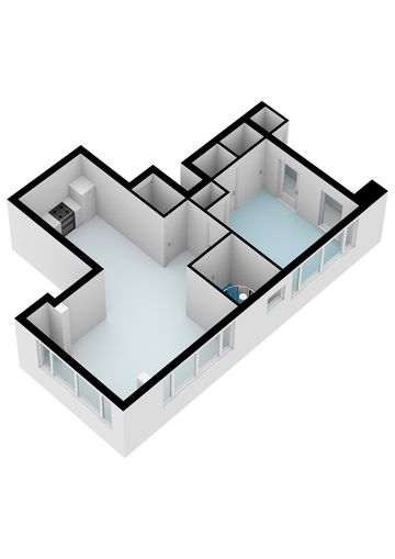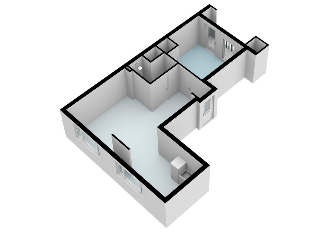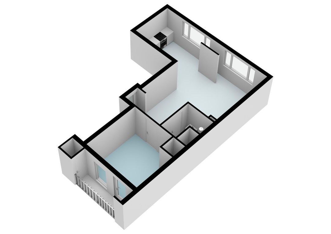 Appartement linkerzijde: L-vormige woonkamer met keuken, badkamer met douche, toilet en wastafel, slaapkamer aan de voorzijde met 2 vaste kasten en een balkon.
