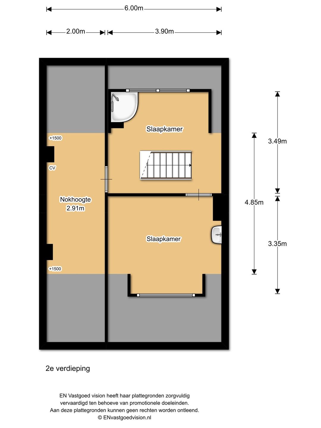 Deur met trap naar de 2e verdieping: overloop met dakkapel en douchecabine, ruime slaapkamer aan de voorzijde met een dakkapel en wastafel. Deur naar ruime bergzolder met de CV-installatie en een Velux dakraam.
