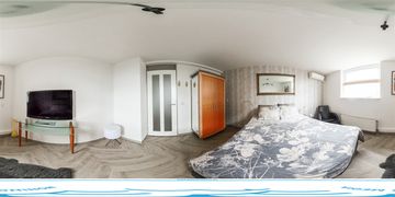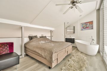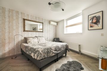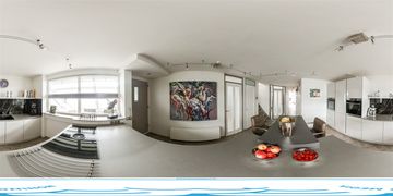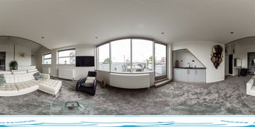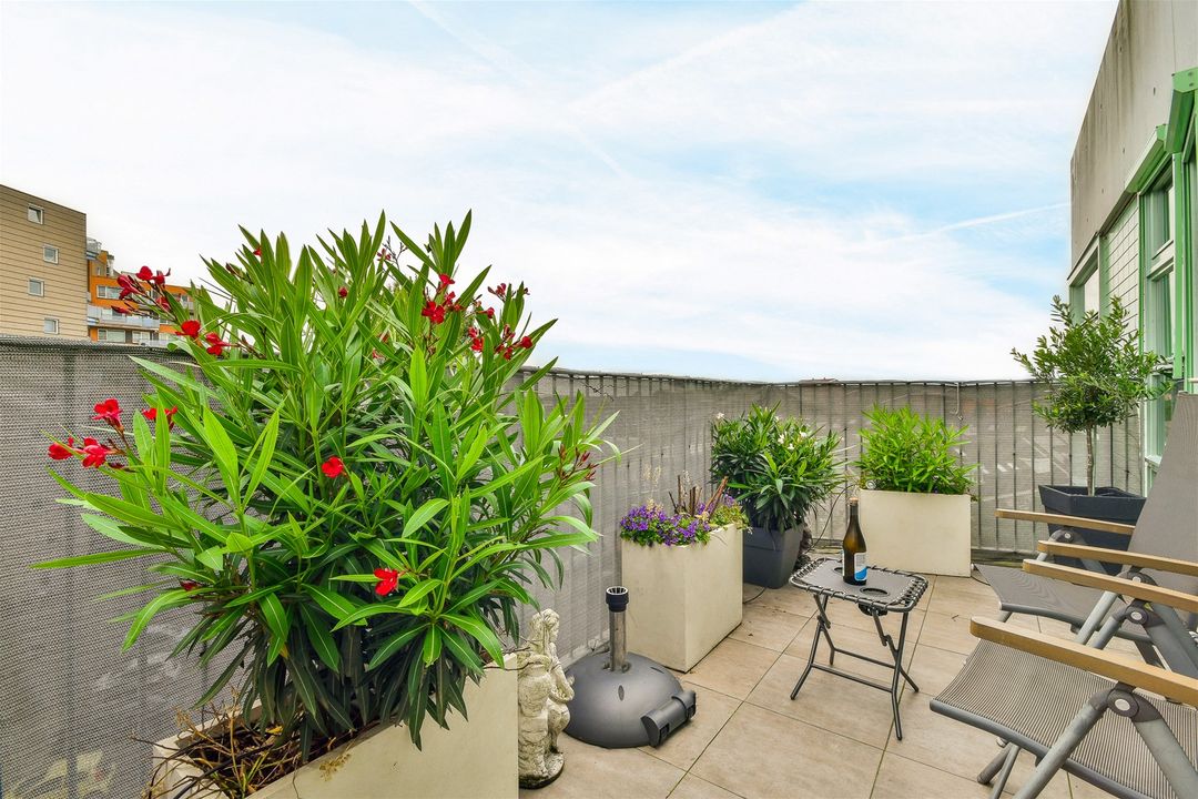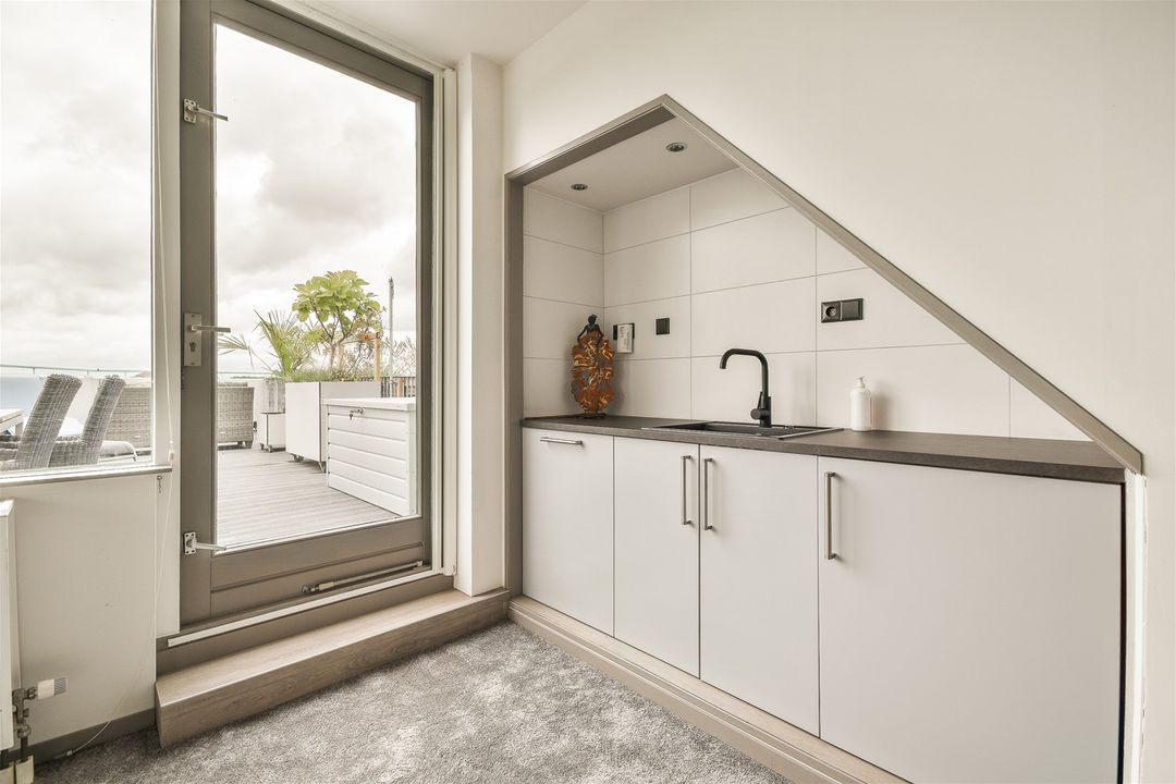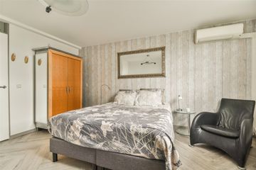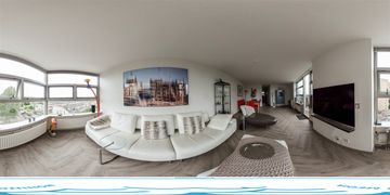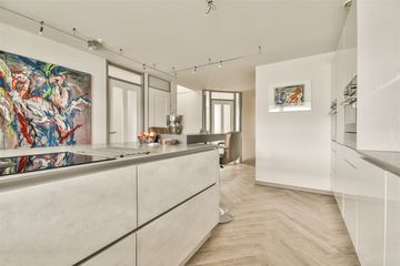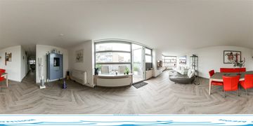 Central entrance in the atrium and from there through the elevator or the stairwell access to the fifth floor, where the entrance is of the apartment. The spacious luxury open kitchen equipped with a cooking island and various AEG built-in appliances, including: oven, combi microwave, dishwasher and an induction hob with built-in extractor hood. Next to the kitchen is a bedroom which is equipped with air conditioning and the stairs to the 6th floor. The spacious living room with door to the west-facing balcony, adjacent to the work/hobby room or the 2nd bedroom with a large closet under the stairs. The luxurious bathroom has a walk-in shower and a double sink with mirror. Separate toilet and spacious storage room with washing machine connection and central heating boiler.