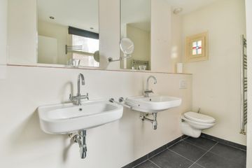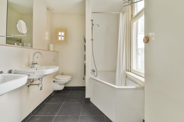 – de badkamer is voorzien van een hoek ligbad met handdouche, twee wastafels met spiegel, toilet (zwevend) en een handdoekradiator;