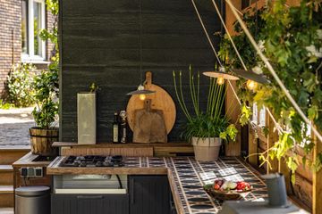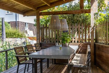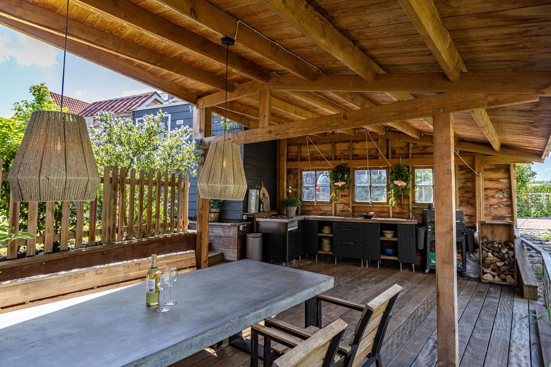 – Tuin voorzien van houten berging met elektra, zithoek en een steiger met buitenkeuken onder een overkapping en uitzicht over water;
