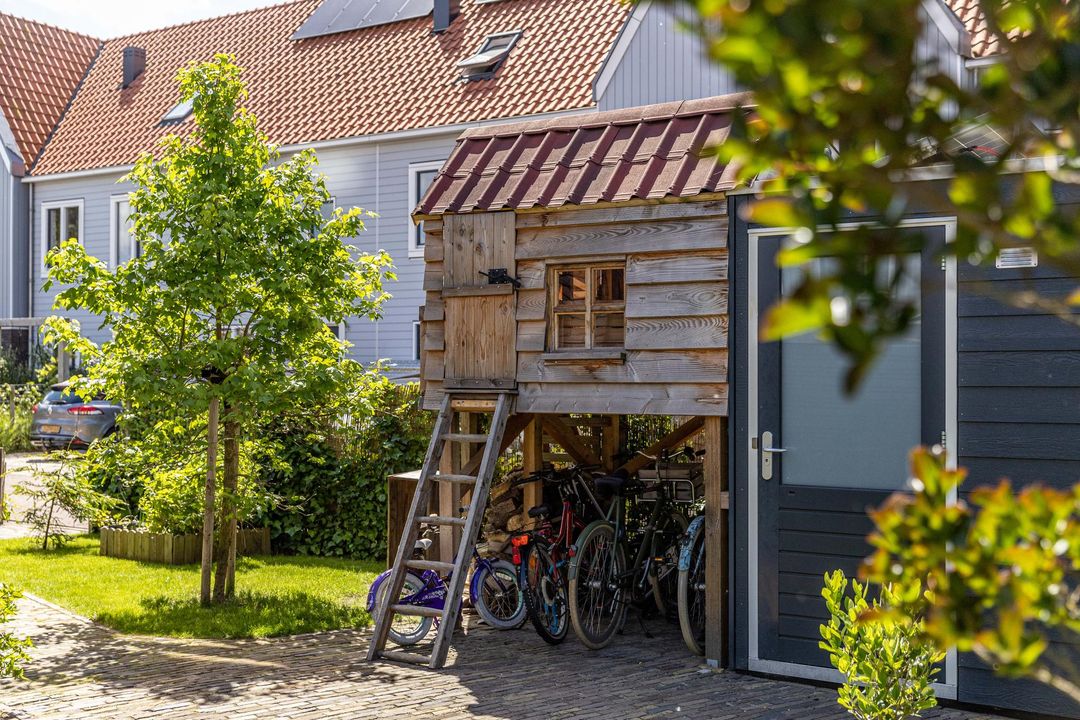 Vrijstaande berging in de tuin met een sfeervolle speelhut voor de kinderen.