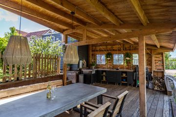 – Garden with wooden shed with electricity, sitting area and a jetty with outdoor kitchen under a canopy and water views;