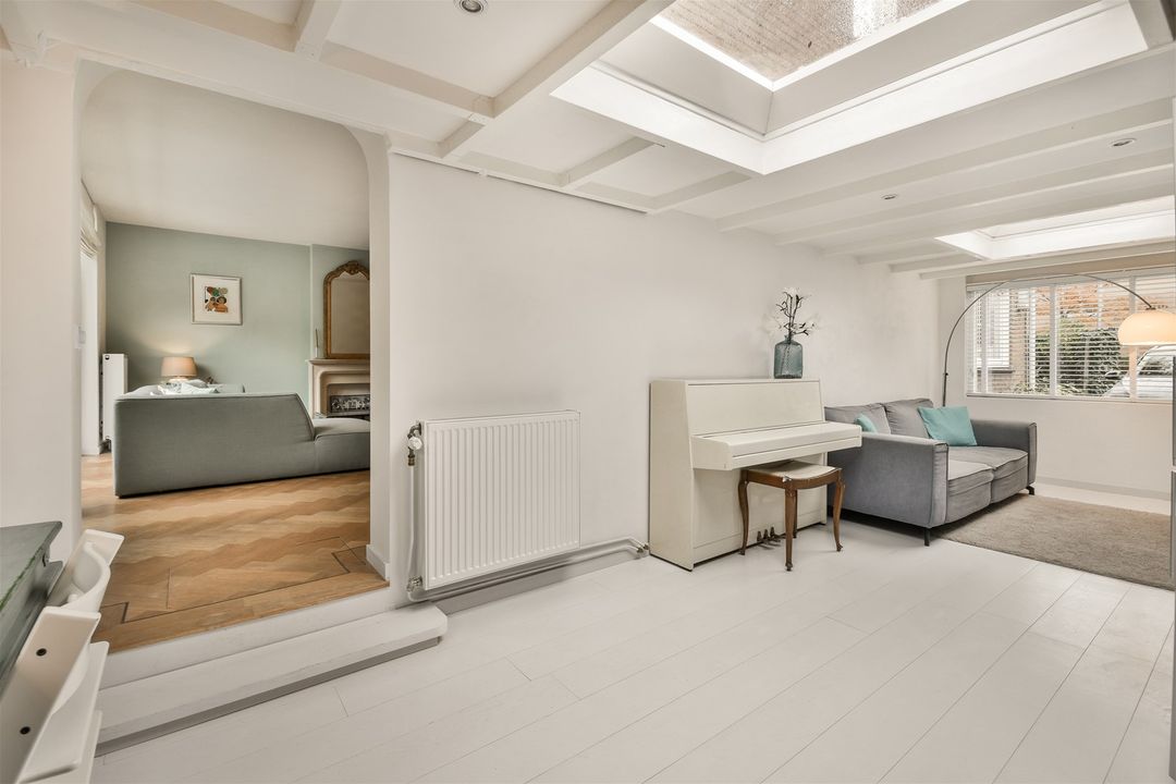 Entree, hal met toiletruimte, meterkast en entree naar de woonkamer. Zeer royale, uitgebouwde woonkamer met sierhaard en een moderne open keuken aan de voorzijde voorzien van diverse inbouwapparatuur. Vanuit de woonkamer toegang tot achtertuin met houten berging met een fantastisch overdekt terras en een achterom. De naastgelegen garage is verbouwd tot een speel-/werkkamer (uitstekend geschikt als extra slaapkamer of kantoor aan huis) voorzien van raampartijen, radiator en twee dakkoepels voor extra lichtinval.