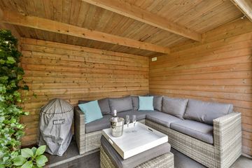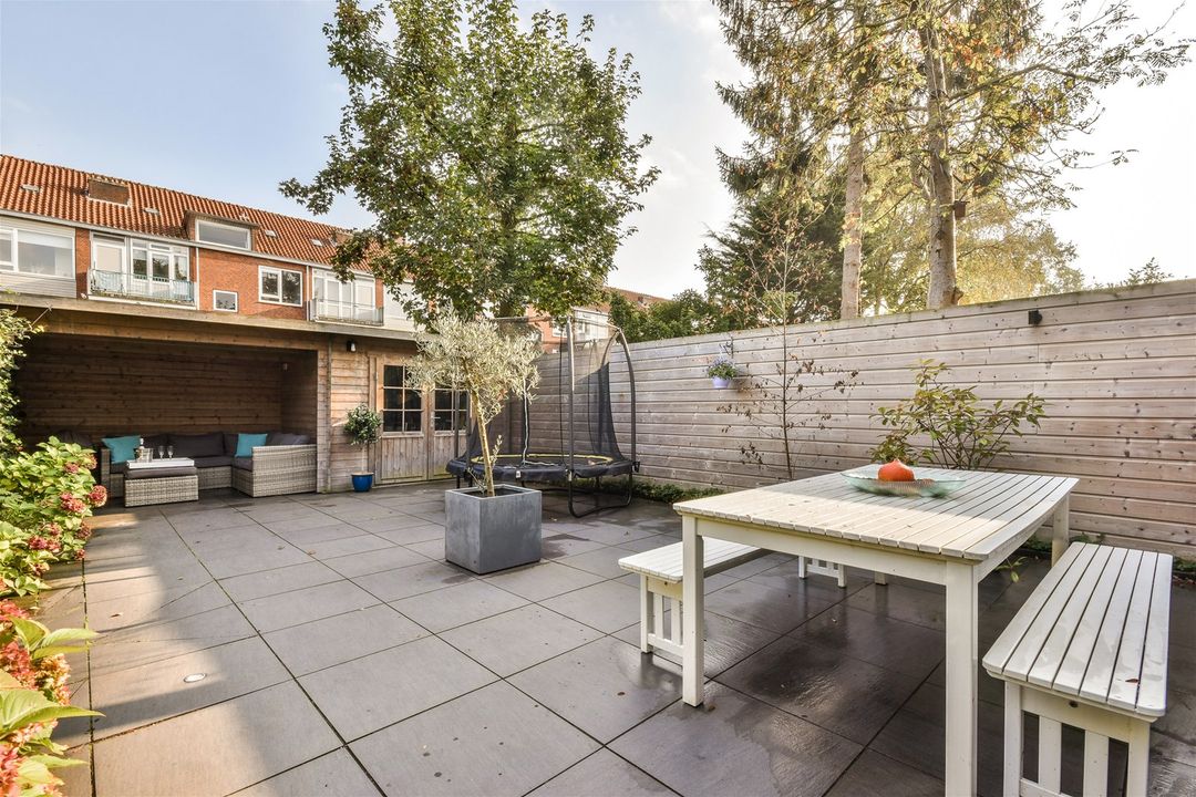 – Fraaie achtertuin met zonnescherm, rolluiken, tuinverlichting in (Italiaanse keramische) tegels, elektra, buitenkraan; – Houten berging en overdekt terras met verlichting;