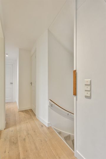 Eerste verdieping bereikbaar middels vaste trap: lichte overloop met toegang tot alle vertrekken. 2 slaapkamers aan de achterzijde, slaapkamer aan de voorzijde met een frans balkon, moderne badkamer (met raam in de zijgevel) voorzien van ligbad, een inloop regendouche, dubbele wastafel in meubel, handdoekradiator en een separaat toilet met fontein. De ‘oude’ badkamer is thans in gebruik als waskamer.