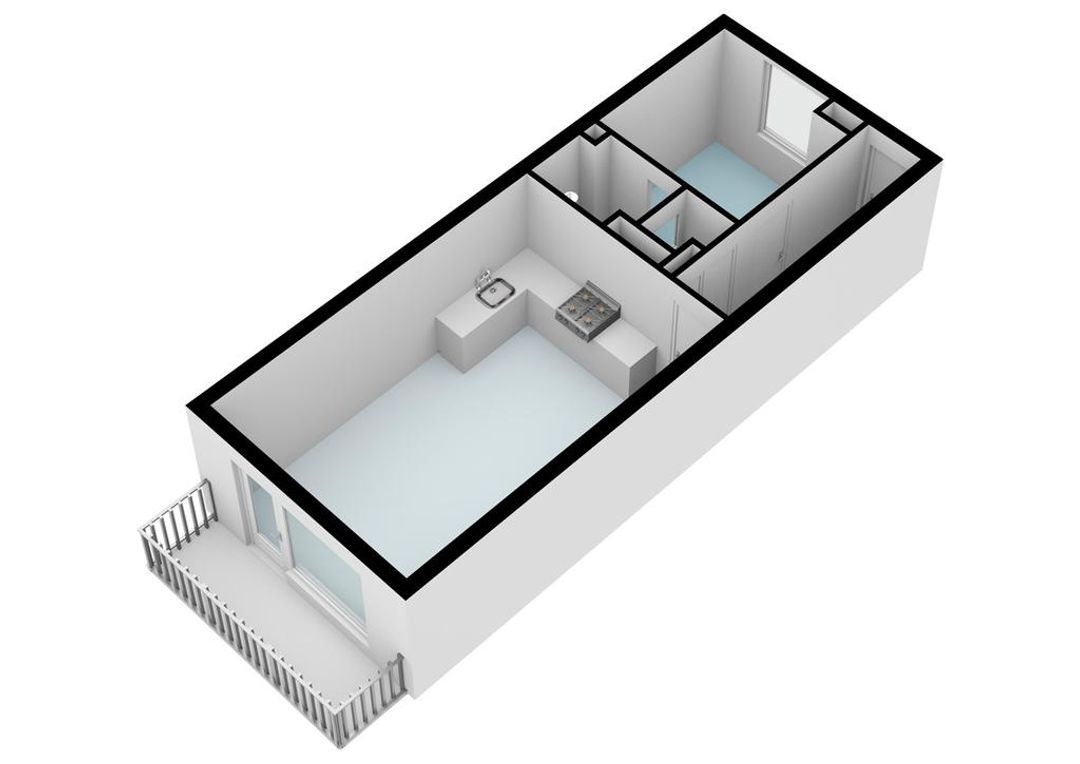 Entree woning op de 8e etage. Hal met separaat toilet en gangkast, toegang slaapkamer met aansluitend de badkamer voorzien van inloopdouche en wastafel. Woonkamer met open L-vormige keuken voorzien van diverse inbouwapparatuur.