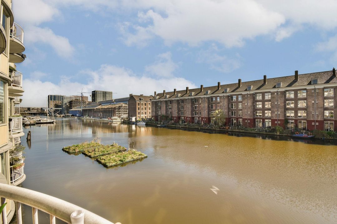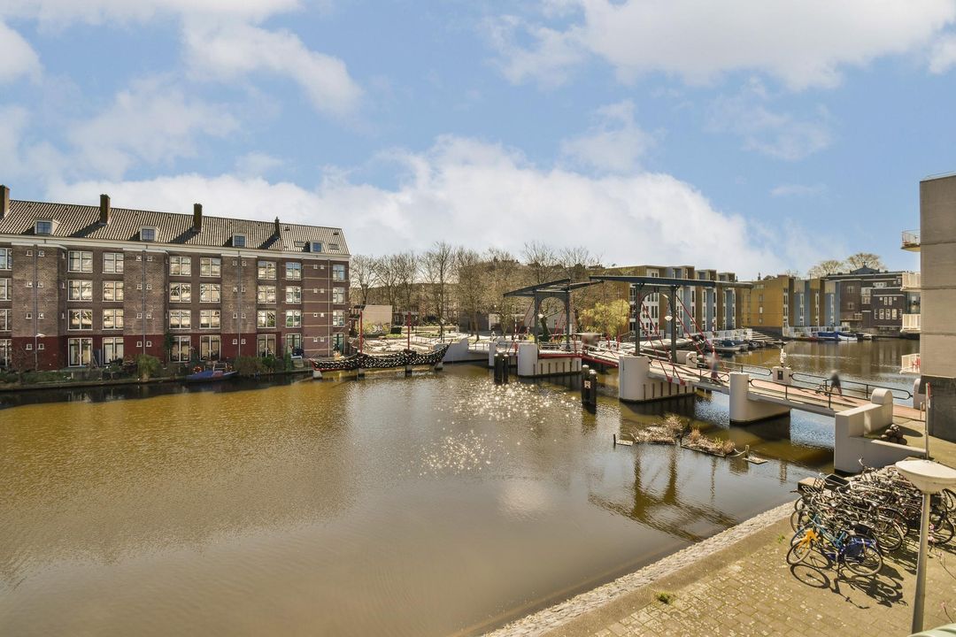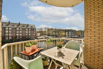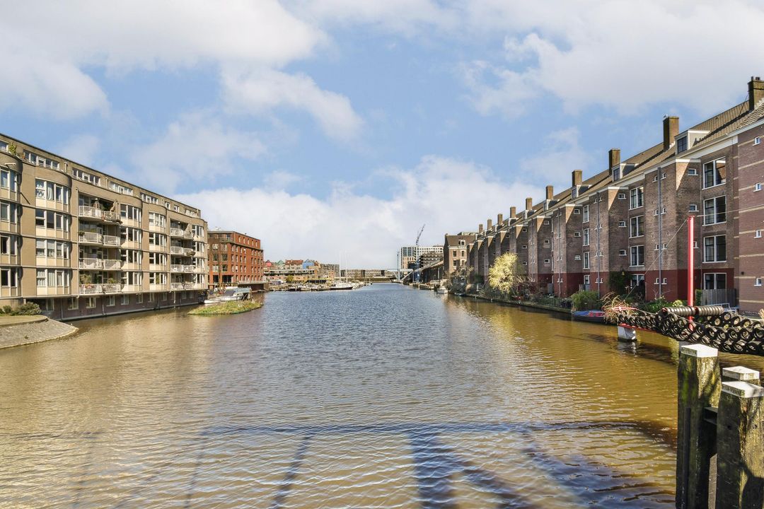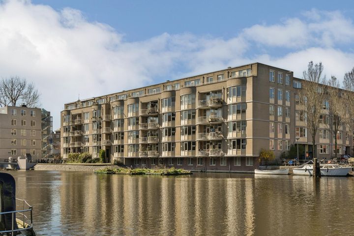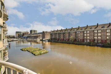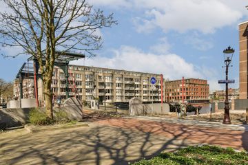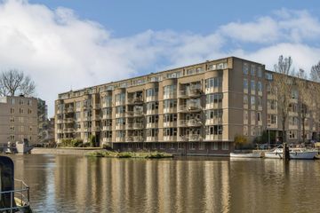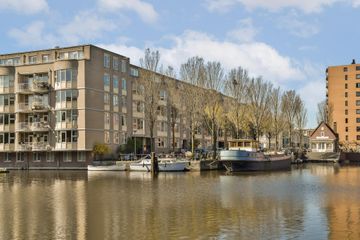 You enter the building via the quay that runs along the water, completely car-free. Through the communal, neat, by the VVE maintained staircase you reach the apartment on the 1st floor. Behind the private entrance is the hall which gives access to all rooms. At the front is the spacious bright living room located with large semi-circular windows with casement windows. Here you have a wonderful panoramic view of the water, the old warehouses of the VOC shipyard, the art object: the Tire Boat and the iconic Donkey Bridge for cyclists. From the living room the semi-open kitchen with balcony is accessible. The free and intimate balcony is a very pleasant addition to this apartment: located on the southeast (until about 3 p.m. the sun), unobstructed views of the water and no direct neighbors to the balcony. The kitchen is equipped with various built-in appliances such as an oven, 4-burner gas stove with extractor hood, sink and dishwasher. The two spacious bedrooms, both suitable for a double bed, are situated at the rear facing the quiet and well-kept courtyard garden. The bathroom has a walk-in shower, sink and closet. The separate toilet is located next to the bathroom and there is a practical storage room with washer and dryer.