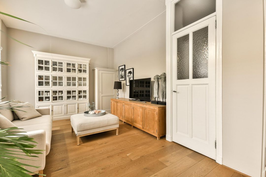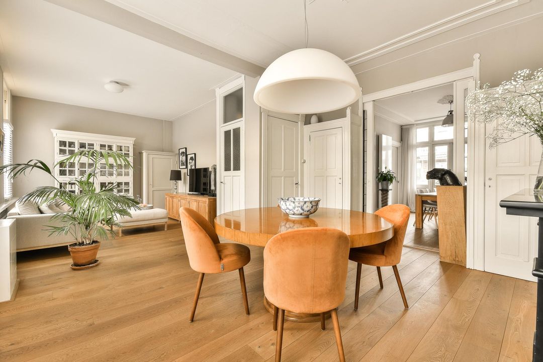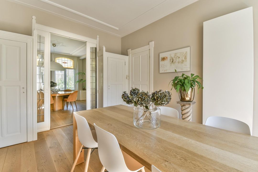 Hal/overloop, intercom, gasten toilet voorzien van fontein en ruime extra garderobekast. De centrale hal verschaft middels meerdere deuren toegang tot het woongedeelte, eetgedeelte en woonkeuken. De L-vormige woonkamer is voorzien van een karakteristiek Frans balkon (O), stijlvolle en-suite met inbouwkasten, twee marmeren schouwen en klassieke radiatoren en glas in lood. De grote raampartijen zorgen voor een zeer lichte woonkamer. De eetkamer grenst zowel aan de woonkamer als de keuken en heeft middels openslaande deuren toegang tot het balkon voorzien van elektrisch zonnescherm met middag- en avondzon (W). De woonkeuken beschikt over zeer veel opbergruimte en voldoende werkruimte. Daarnaast is de keuken voorzien van een prachtig robuust 5 pits gasfornuis met oven van het merk SMEG, vaatwasser, combi magnetron en quoocker.