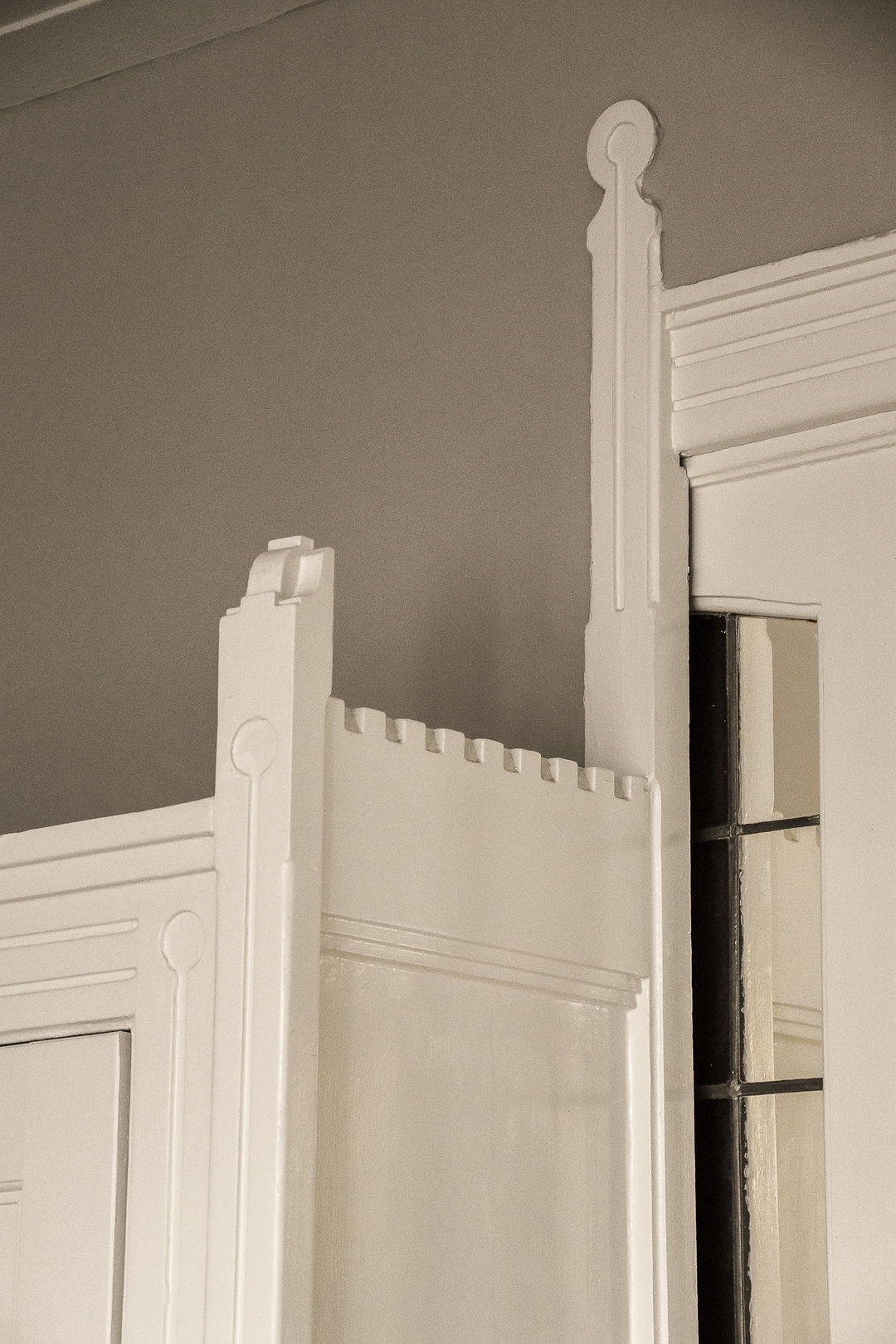 The entire floor has an oak wooden floor and original ceiling ornaments.