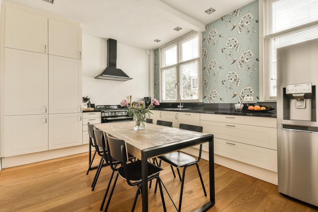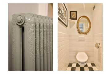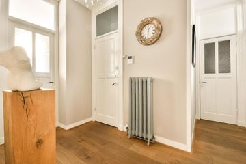 Hallway/landing, intercom, guest toilet with fountain and a spacious extra wardrobe. The central hall provides access through several doors to the living area, dining area and kitchen. The L-shaped living room has a characteristic French balcony (East), stylish en-suite with fitted wardrobes, two marble fireplaces, classic radiators and stained glass. The large windows provide a very bright living room. The dining room is adjacent to both the living room and the kitchen and has access through sliding doors to the balcony with electric sunshade with afternoon and evening sun (West). The kitchen has plenty of storage space and ample work space. In addition, the kitchen is equipped with a beautiful 5 burner cooker with oven of the brand SMEG, dishwasher, microwave and quoocker.