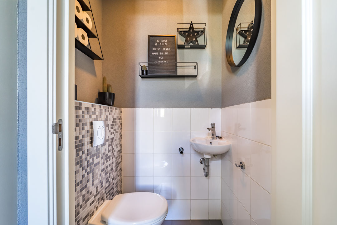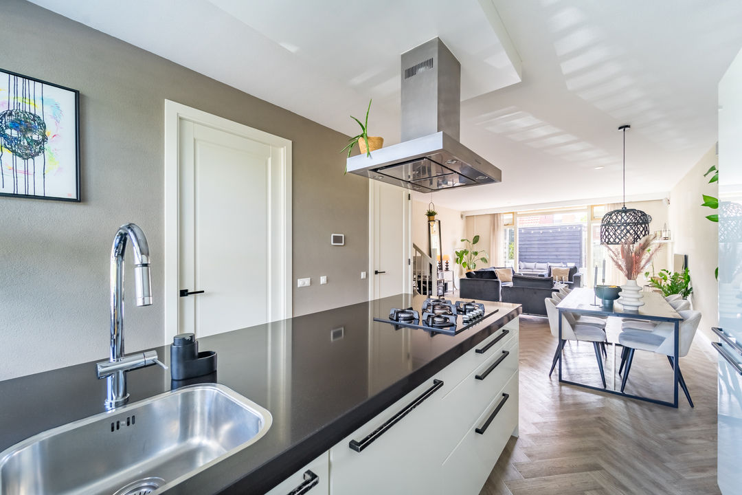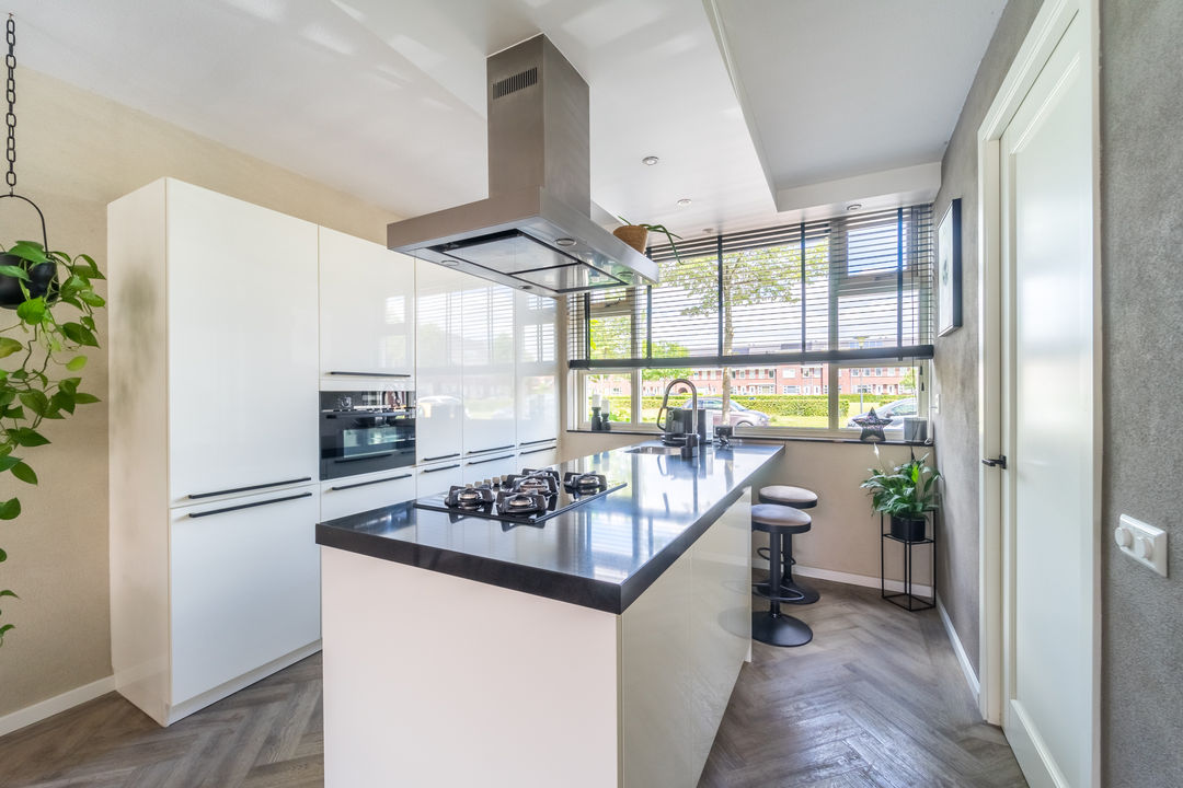 First floor: Entrance hall with meter and closet, toilet with fountain. Bright expanded living room with underfloor heating and a recently laid PVC herringbone floor. Open modern kitchen with cooking and sink island with a 5-burner stove, extractor, combination oven, dishwasher and fridge / freezer. Stairs in the living room (with generous staircase closet) to the second floor.