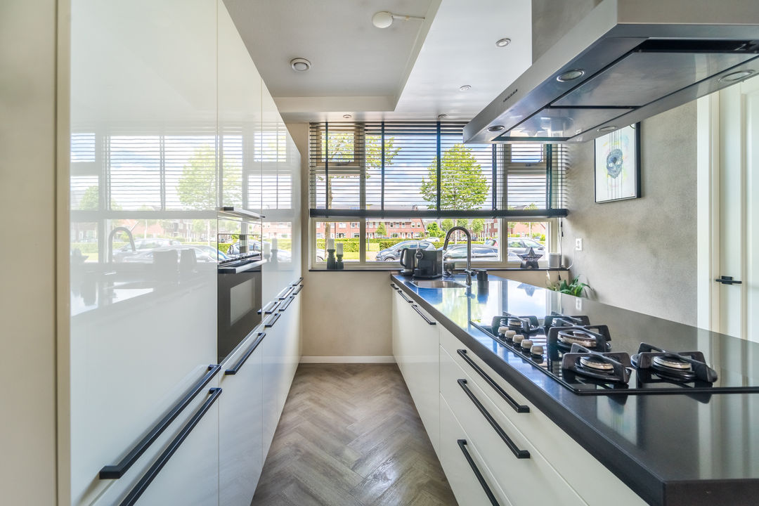 – Moderne hoogglans keuken met 5-pits gasfornuis met afzuigkap, een recent vernieuwde vaatwasser, koel-vriescombinatie en een combinatie oven;