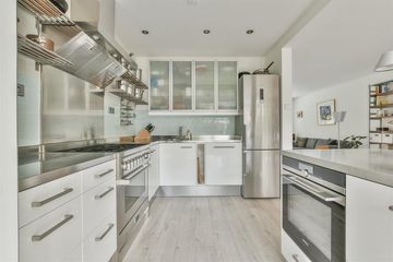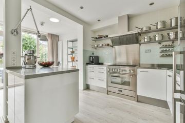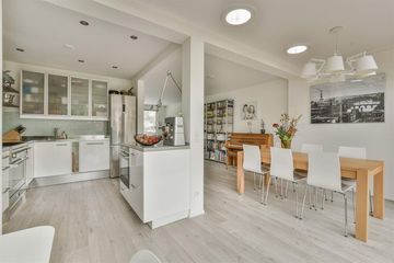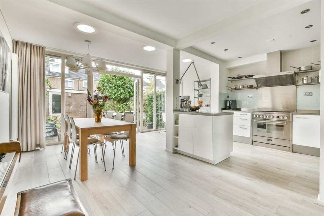 is aan de achterzijde over de gehele breedte uitgebouwd met open keuken met inbouwapparatuur, eetgedeelte en een werk-/studiehoek. Openslaande deuren geven toegang tot de tuin.
