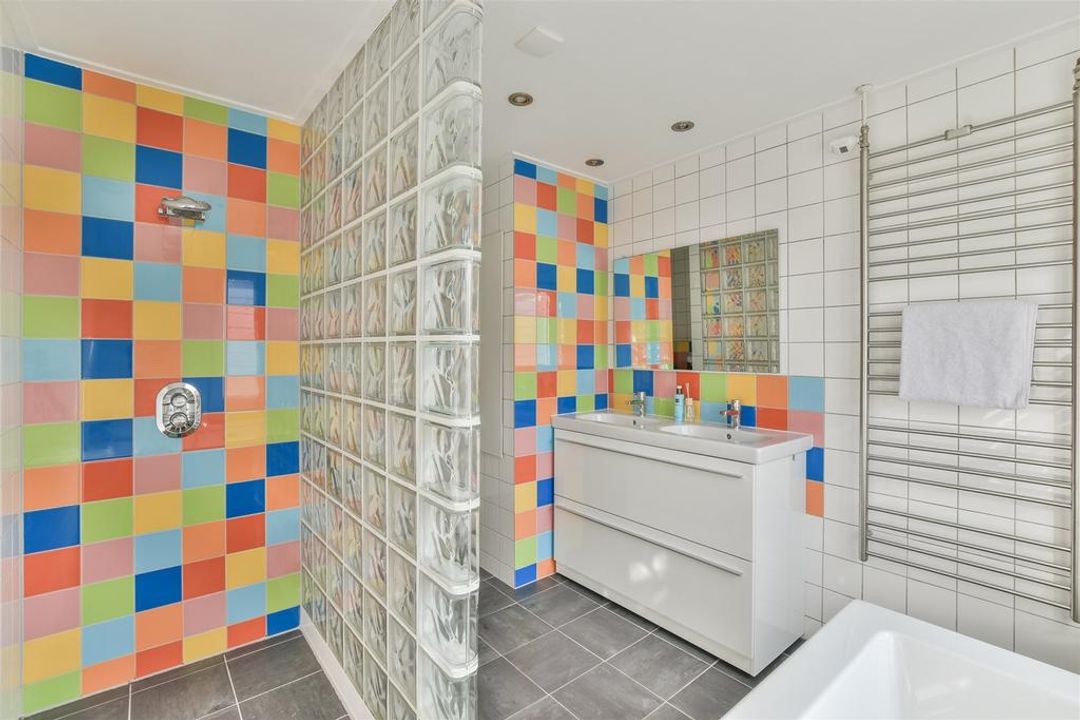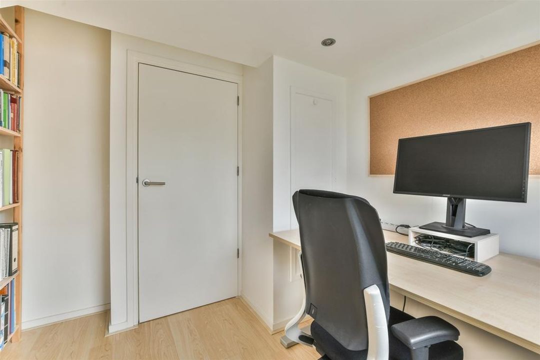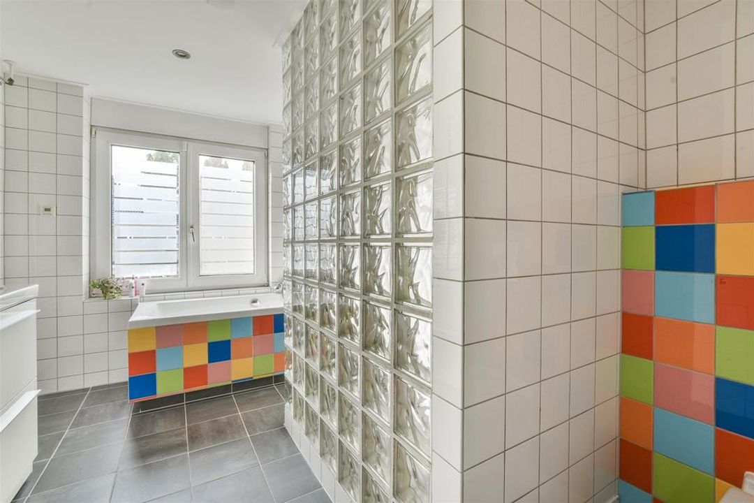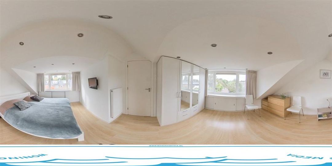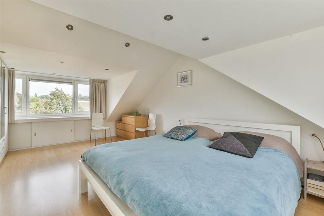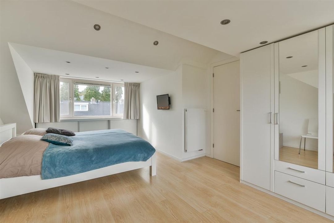 Via de trap komt u op de overloop van de eerste verdieping: hier bevinden zich twee slaapkamers, een moderne zeer ruime badkamer met ligbad, inloopdouche, dubbele wastafel in meubel, handdoekradiator en een 2e toilet. Voorts bevindt zich hier een separate was-/strijkruimte Trap naar de 2e verdieping: overloop met dakraam, bergruimte, toegang naar de werkkamer en de ruime hoofdslaapkamer. Zowel aan de voor- als achterzijde een dakkapel waardoor het mogelijk is hier twee separate slaapkamers van te maken. Lichte zonnige tuin op het westen met een fietsoverkapping, berging en achterom