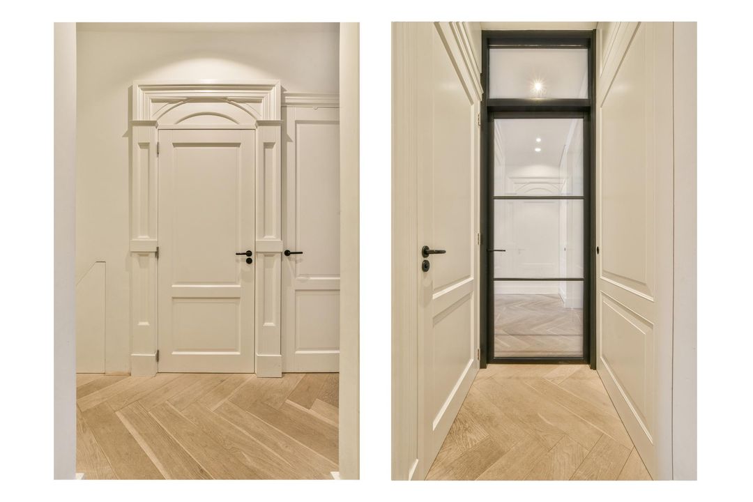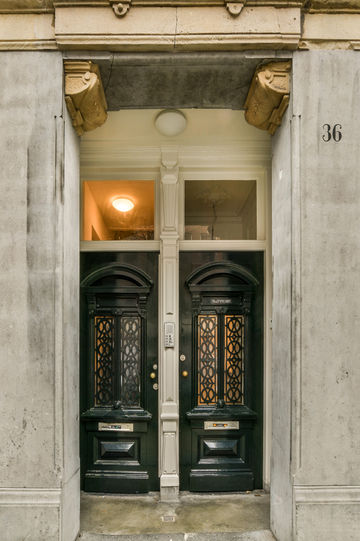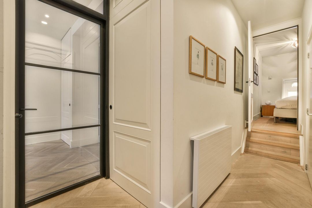 Entrance on the first floor, access to the apartment. The central hall provides access to all rooms and is equipped with a nice wardrobe. The living room is located at the front and has a beautiful fireplace. The luxurious open kitchen is located at the rear and equipped with various appliances, including a gas hob with extractor hood, dishwasher, 2 ovens and fridge with freezer drawers. What stands out is the very generous ceiling height of 3 meters and the beautiful ensuite between the living room and kitchen. From the kitchen you have access through double doors to the spacious rear terrace, here you can enjoy the sun all day! Both bedrooms are accessible from the hall and are located at the front and rear of the apartment. The front bedroom has a beautiful characteristic round window and has a built-in closet. At the rear is the 2nd bedroom which has access to the rear roof terrace. The sitting room can easily be created as a 3rd bedroom. The luxurious bathroom has a walk-in shower, built-in furniture with sink. The toilet is separate. The washer and dryer connections are beautifully hidden in a separate closet.