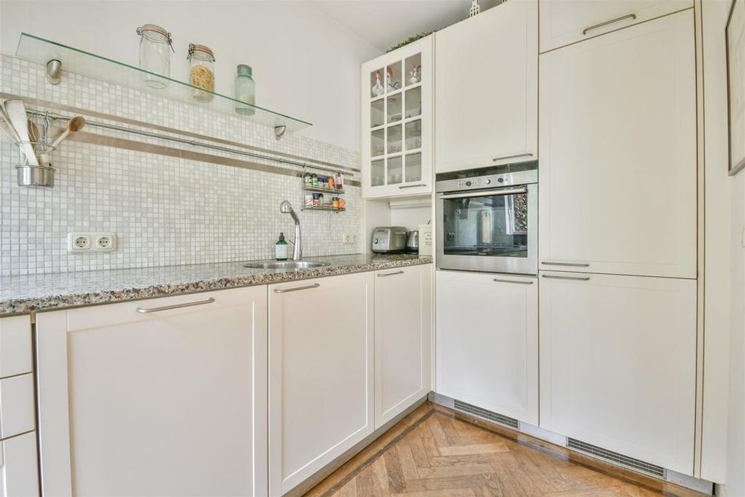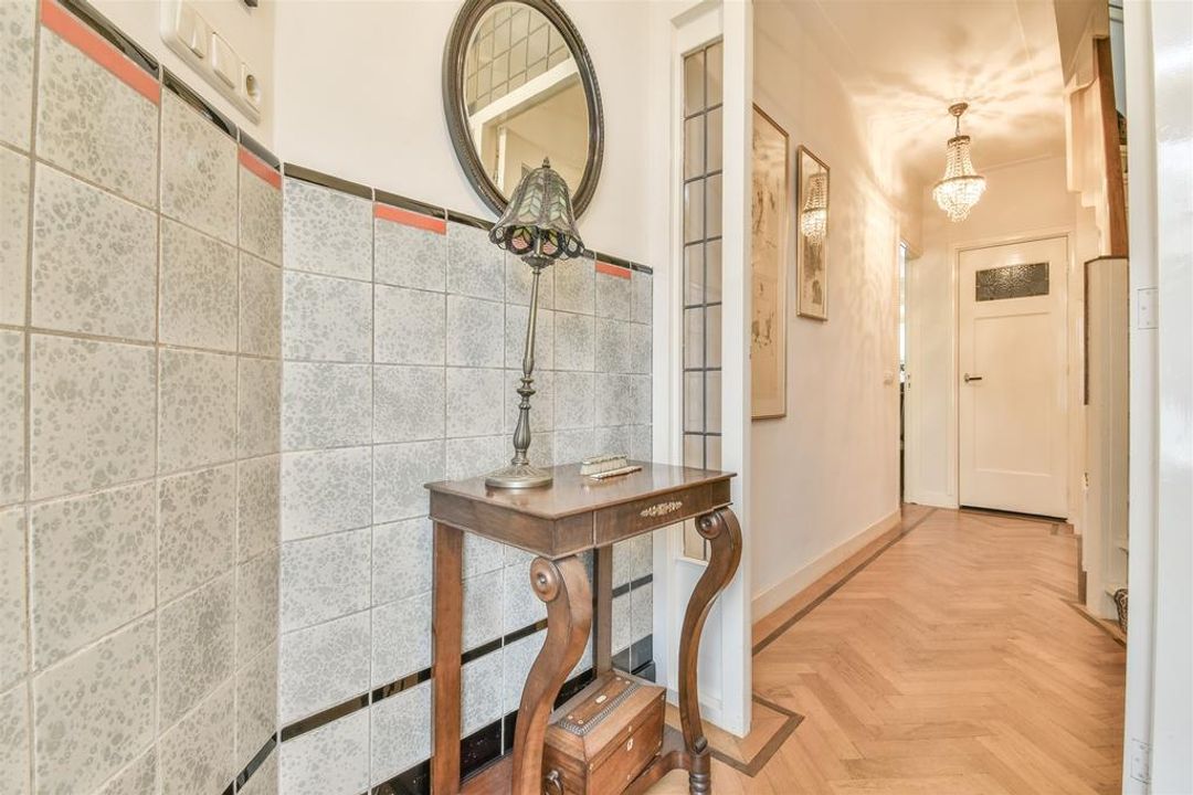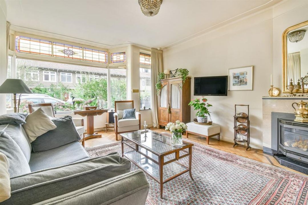 Begane grond: voortuin. Entree woning, tochtportaal, hal met toegang tot kelderkast en het separate toilet met fontein. Entree deur naar de royale, woonkamer met sfeervolle erker aan de voorzijde, openhaard en open keuken aan de achterzijde. De keuken is voorzien van diverse inbouwapparatuur o.a. 4 pits gasfornuis, vaatwasser, koelkast met vrieslades, oven en afzuigkap. De begane grond is tevens voorzien van een zeer fraaie massief eiken visgraat vloer met bies alsmede de originele ensuite deuren. Middels openslaande deuren is de zonnige tuin toegankelijk (circa 90 m²) welke een gunstige zonligging op het zuidwesten heeft. Daarnaast beschikt de achtertuin over een schuur en achterom.