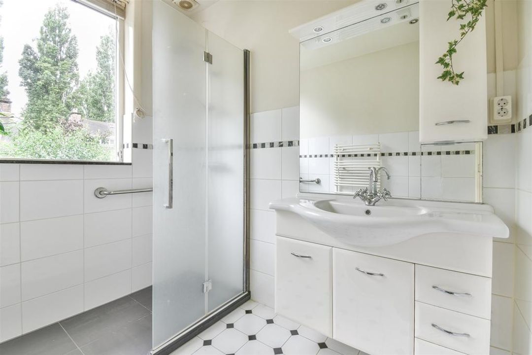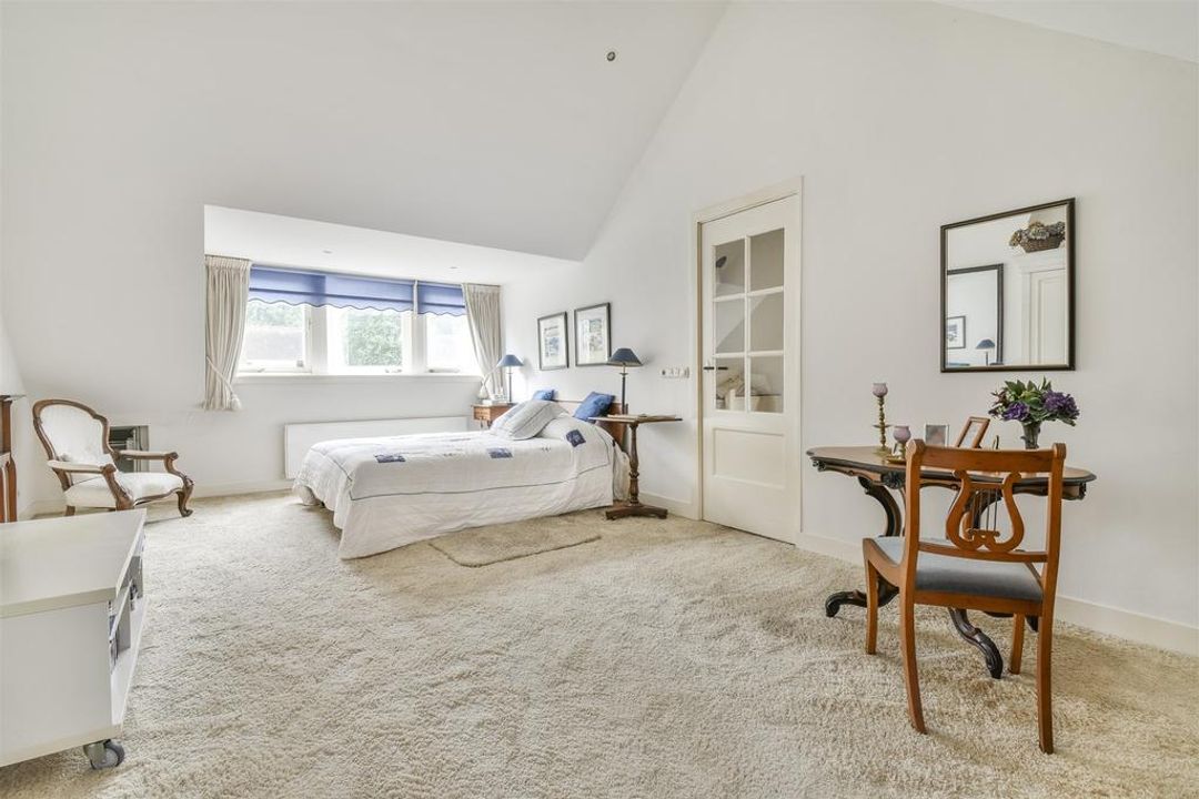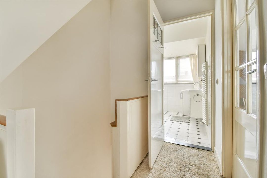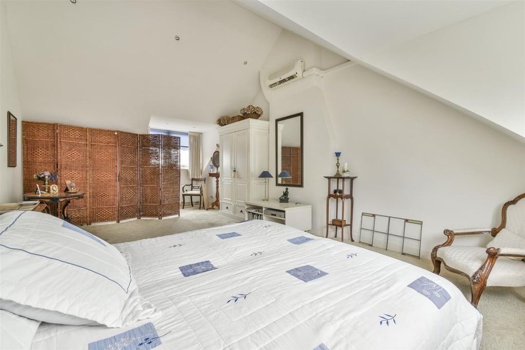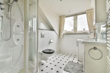 Tweede verdieping: Overloop met bergruimte, wasmachine- en droger en kast met cv-installatie. Ruime slaapkamer met aan weerszijde een dakkapel en een sfeervol hoog plafond. Deze verdieping beschikt tevens over airconditioning en een eigen badkamer voorzien van een douche, handdoekradiator, wastafelmeubel en toilet.