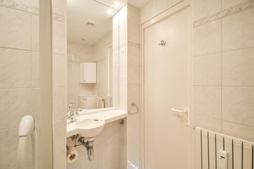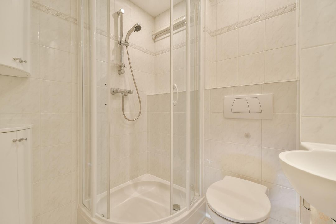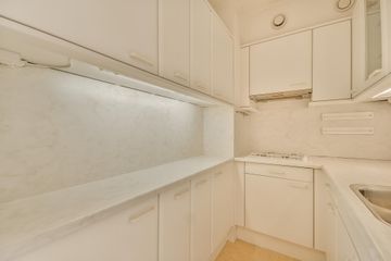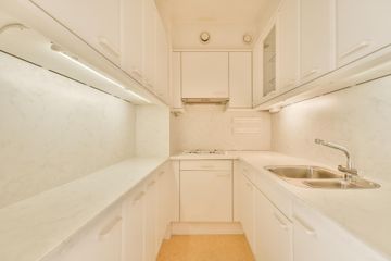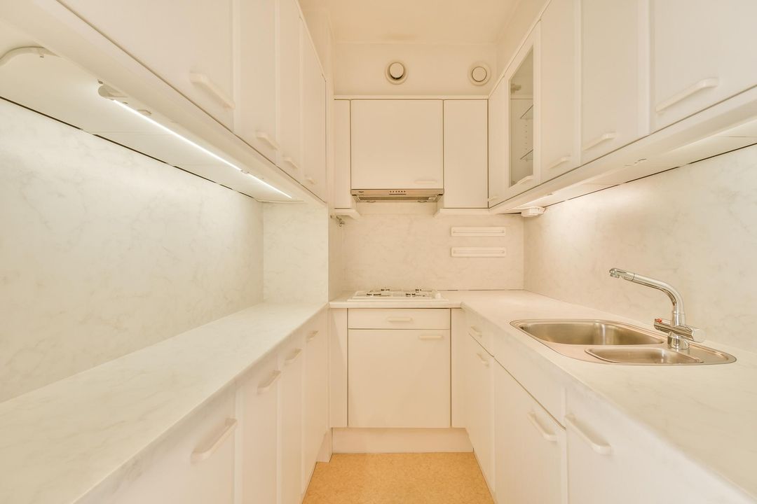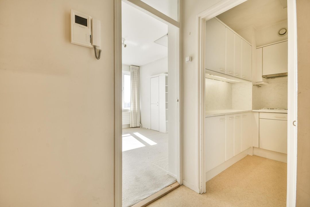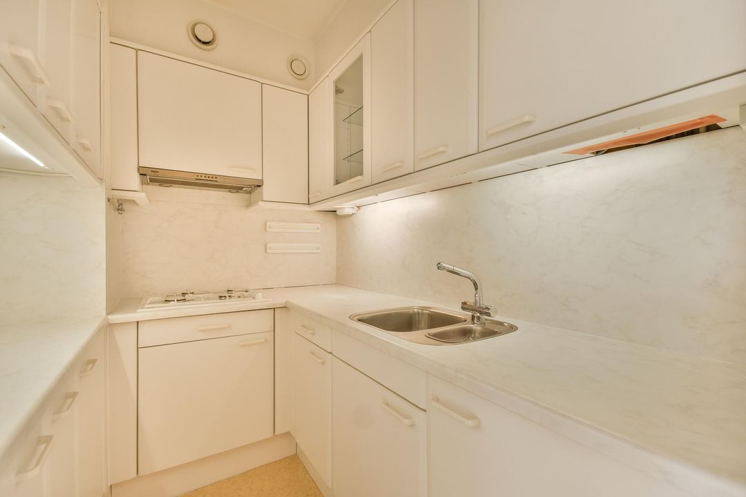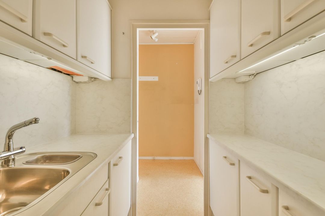 8e Verdieping: Via het gedeelde portaal, komt u middels de voordeur in de woning met aan de rechterzijde de entree naar de keuken. In de keuken bevindt zich een gaskookplaat met afzuigkap, een koelkast en een spoelbak. De keuken bevat aan beide zijden veel opbergruimte en is er veel aanrechtblad aanwezig. Tevens een eerste aanleg voor een wasmachine.