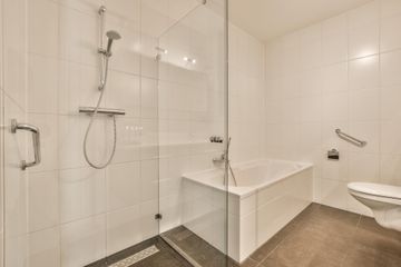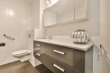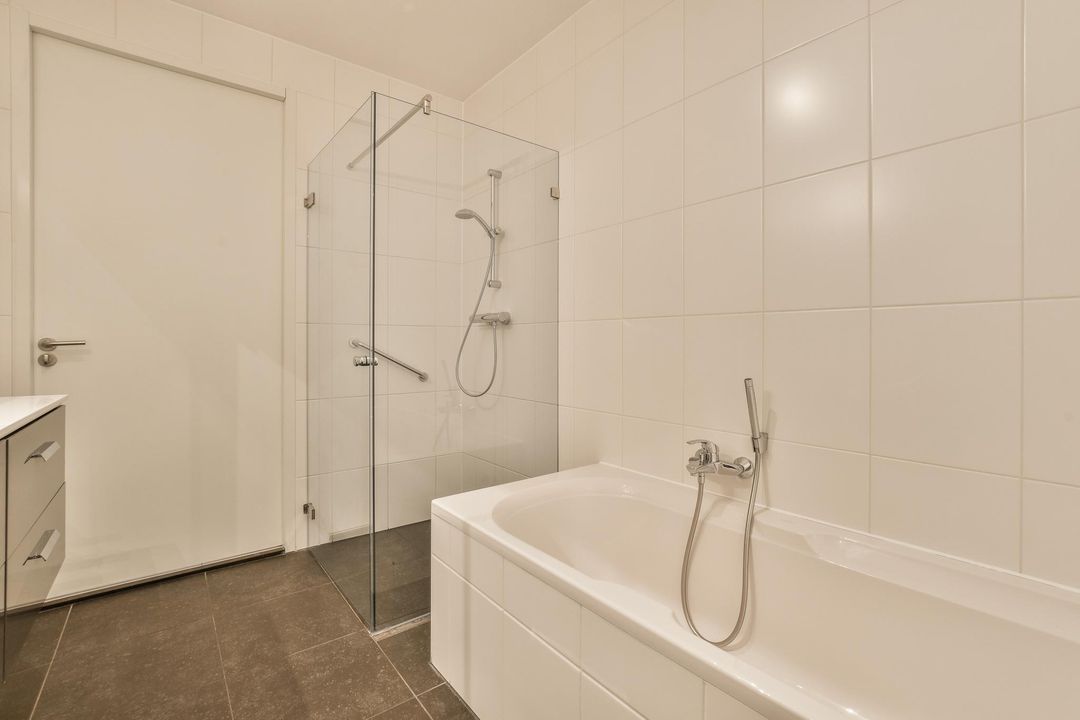 – badkamer betegeld tot aan het plafond, witte wand- en antraciet vloertegel;