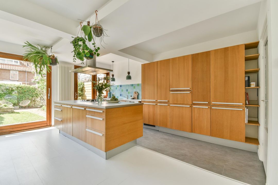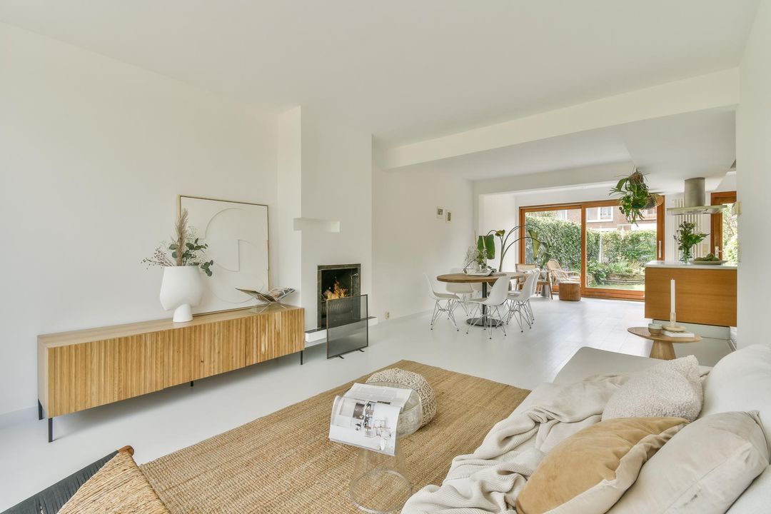 First floor: the expanded bright spacious living room with fireplace and large open kitchen directly to the garden. Through the large sliding doors is access to the sunny, quiet and large garden with its own stone shed with electricity, gate to back.