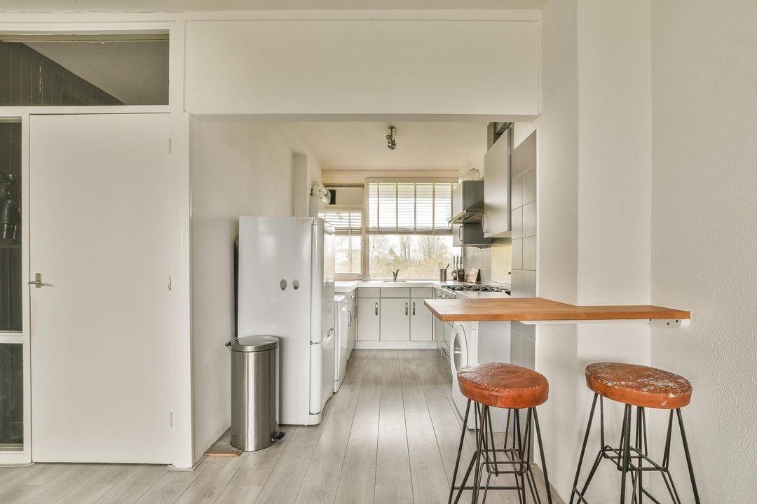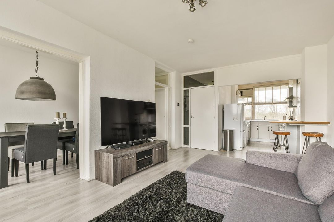 Hallway with wardrobe and meter cupboard, open kitchen with spacious living room on the south side, open side room which is currently used as a dining room (possibility 3rd bedroom), corridor to toilet, bathroom and two bedrooms. Bathroom with bathtub and shower, towel radiator, washbasin. The living room, dining room and rear bedroom have access to the balcony ( south ). Furthermore, the entire house has a light laminate flooring and double HR++ insulating glass.